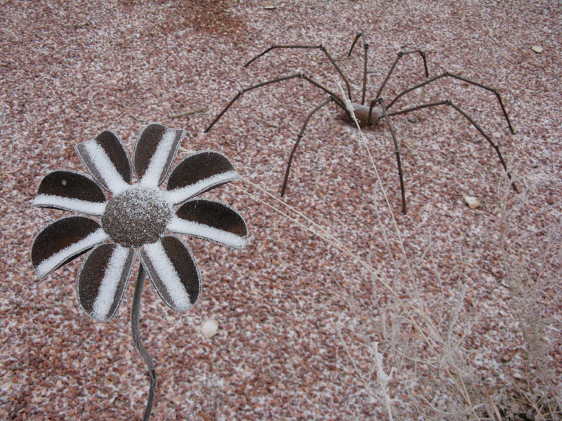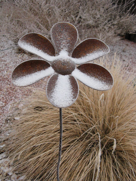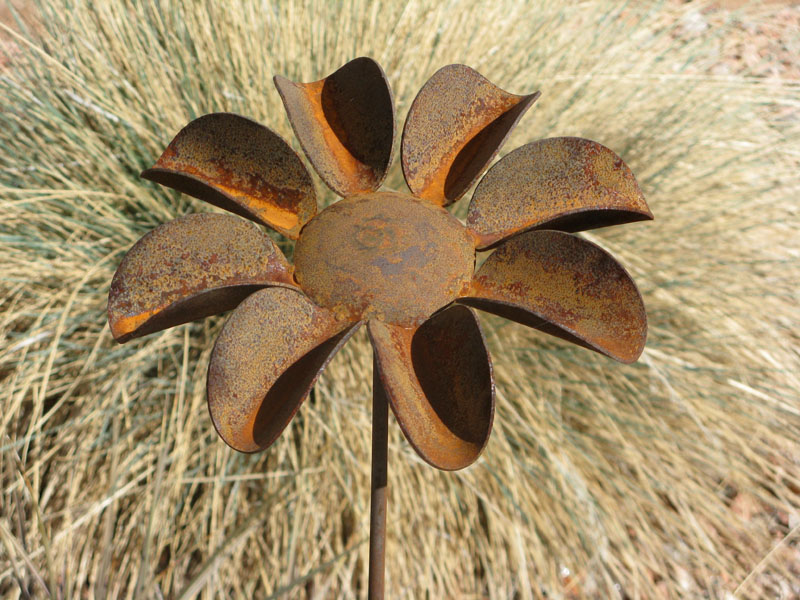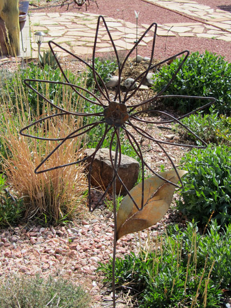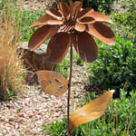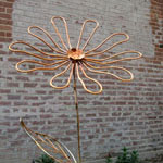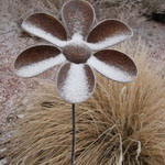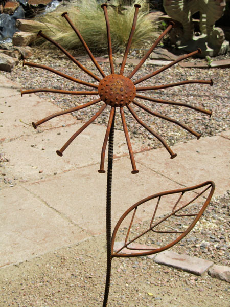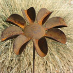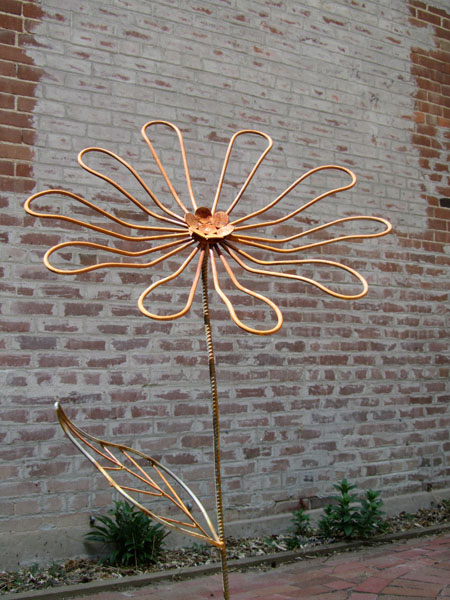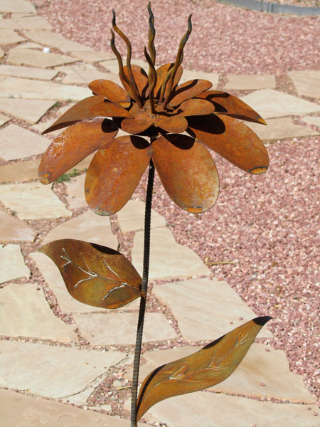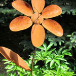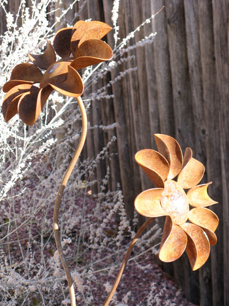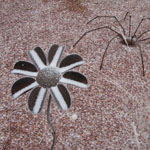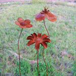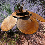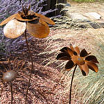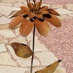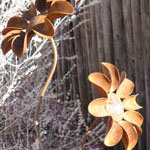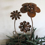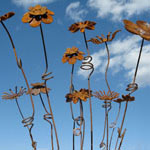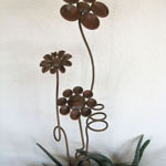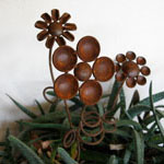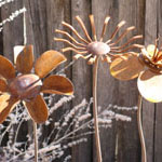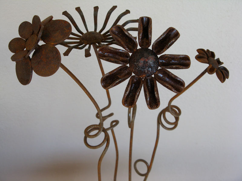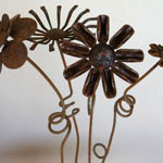 Using scrap steel, old nails and wire, Julie forms and welds the parts together to create her flowers. They can spruce up empty flower pots in winter, enhance a summer garden or add wimsy to indoor potted plants. While requiring no water or maintenance Flowerz offer the ultimate in xeriscape gardens.